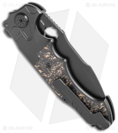 The Alpha folding knife from Andre de Villiers is a masterwork combining functionality and personality. This one has a black CPM-S35VN steel blade that is over four inches long with a jimped spine. It swings smoothly on a ball-bearing system and has both a thumb hole and flipper opener; it can also be opened or closed with a flick of the wrist when the copper-shred carbon fiber-inlaid button lock is held down. A safety switch on the side allows the blade to be locked in the closed position or provides an additional level of safety in the open position. It has a milled titanium handle in a black finish with copper-shred carbon fiber inlays that offers an extremely comfortable grip. A jimped, black titanium backstrap with a lanyard hole and a tip-up, black, titanium pocket clip complete the piece.