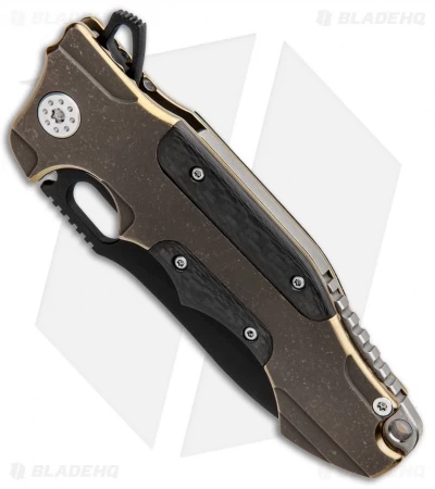 Andre de Villiers has a knack for large folders like the imposing Hummer flipper. This knife sports a black finished blade with a swedge and a long, rounded cutting edge. Smooth carbon fiber inserts set on the bronzed titanium handle provide stunning visual contrast. The titanium frame lock is outfitted with a steel tab/overtravel insert and a milled pocket clip for secure carry.