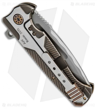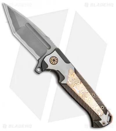 This custom AdV Ronin frame lock knife has a robust titanium handle with a mokumi inlay and a two-tone finish. The compound ground tanto blade has a bead blast/satin imitation Hamon finish. It features a satin finished pocket clip, and a mokumi inlayed backspacer.