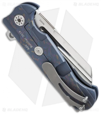 The Butcher is a bold folding knife design from Andre de Villiers. This mid-tech model has excellent feel in hand along with smooth and precise action from the ball-bearing pivot. The high satin finished blade has deep hollow grinds, a fuller groove, and a swedge spine. Special anodized titanium handle with a jimped back spacer and pocket clip