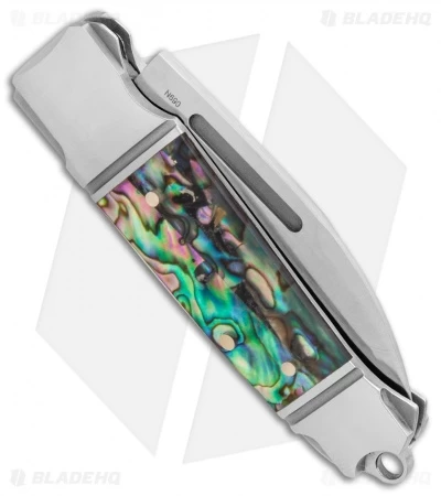 The Mini Impi slip joint features a Bohler N690 steel blade with a satin finish and a bead blasted finger groove for easy opening. A classic ADV stainless steel bolstered design is accentuated nicely by abalone inlays and an extended lanyard hole. Includes a padded velcro pouch for comfortable carry.