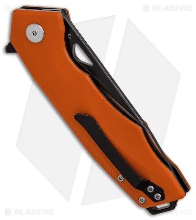 This model of the Bestech Toucan features an orange G-10 handle and a satin blade with a black coating along the spine.