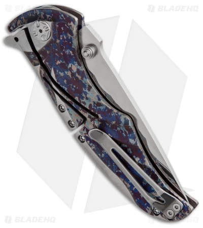 This custom Tighe Coon folder features Glenn Klecker’s NIRK locking mechanism integrated with the fluted purple. gray and blue titanium handle. The hardware and pocket clip are satin finished. The blade is hollow ground with a polished grind. The Tighe Coon comes in a padded nylon pouch.