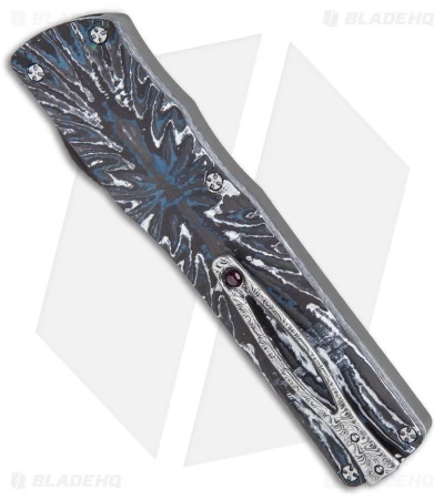 This custom Twist Tighe OTF offers a stunning Brian Tighe design with a 3D machined aluminum and white and blue Fat Carbon Fiber handle. The damasteel blade comes in a dagger style with a plain edge. Item includes a damascus pocket clip and a carbon fiber thumb slide. Add an instant upgrade to your knife collection with the Brian Tighe Custom OTF.