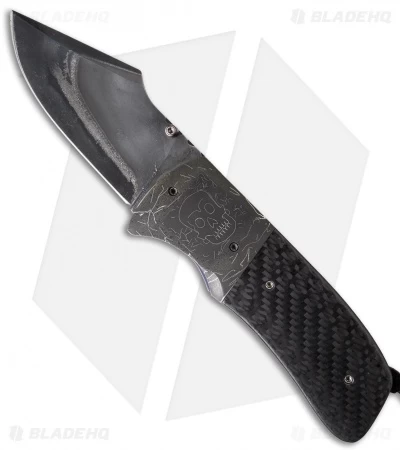This Harpoon folding knife has a 416/52100 San Mai steel blade with a thumb stud opener. The handle features “Skulls” mosaic Damascus bolsters and carbon fiber scales over titanium liners, with lock tab. The steel back spacer is filed, along with the liners and blade spine. This knife includes a signed certificate of authenticity, dated 4/2/15.