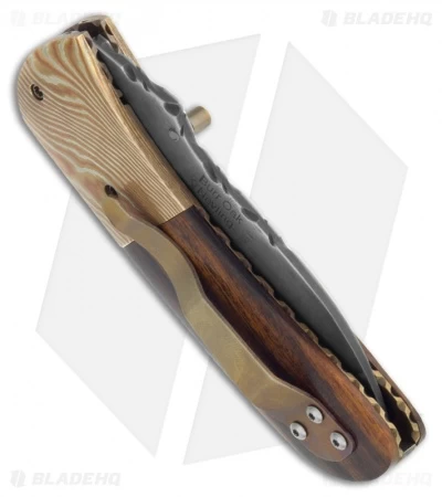 This Snub Nose folding knife is an impressive mix of materials with a high level of refinement that will find a welcome place in any fine collection. The drop point style blade is 416/W2 San Mai Damascus steel with thumb stud opener on front and stamped “Burr Oak Nevling” on back. The handle features Mokume bolsters and beautiful Ironwood scales over titanium liners, with lock tab. The pocket clip is also titanium with a matching bronze finish. The steel back spacer is filed, along with the liners and blade spine. This knife comes with a signed certificate of authenticity, dated 3/5/13.