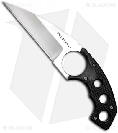 Without a doubt, what really sets it apart from the competition is the big advantage it offers in overall length, and its blade to handle ratio. These advantages are made possible because the Pro Guard’s fiendishly sharp, slant point blade includes an integral finger hole, which in turn makes possible the use of an abbreviated pistol grip handle. It’s fitted with G-10 scales and skeletonized to save weight, making it a natural in the forward-reverse grip. And, thanks to the integral finger hole, there’s no possibility of the hand moving forward onto the blade on impact or losing control of it due to the effects of centrifugal force. (Information from Cold Steel)