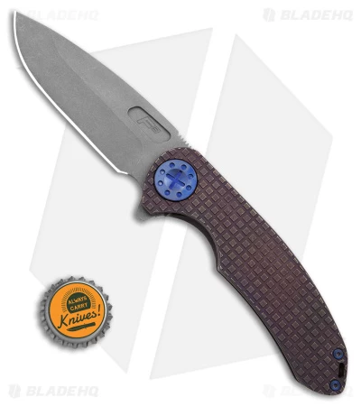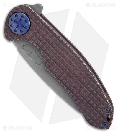 - Textured root beer bronze titanium handle with blue anodized hardware.