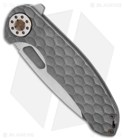 - Textured titanium handle with bronze anodized hardware.