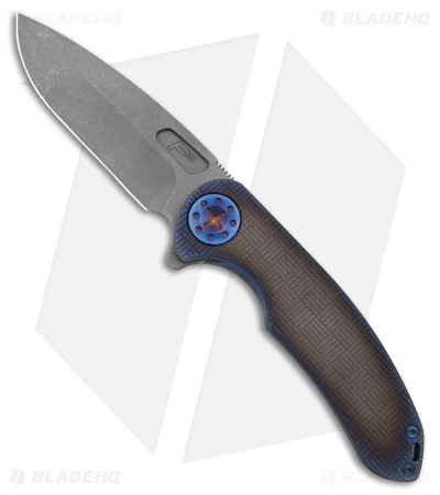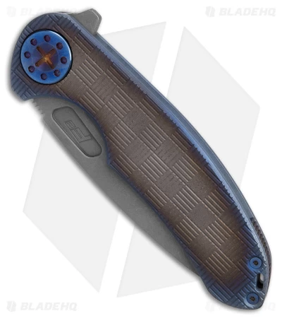 - Textured ombre titanium handle with blue anodized hardware.