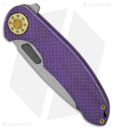 - Textured purple titanium handle with gold anodized hardware.
