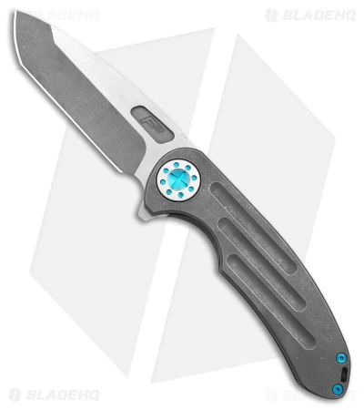 - Milled titanium handle with blue accents.