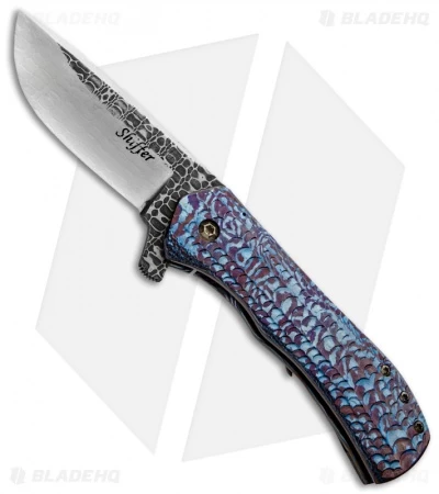 This Doc Shiffer takes the Recon to a whole new level of opulence. It features a Timascus handle and framelock with a dragon scale pattern. Chad Nichols Damascus steel blade, back spacer and custom pocket clip. The blade features polished hollow grinds. This is an amazing Recon flipper!