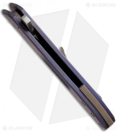 The Field Grade Recon folder is a mid-tech model from Doc Shiffer Knives that displays excellent build quality and smooth action. It has a stonewashed blade with flipper opener and a tumbled, shell case bronze anodized titanium handle and purple pocket clip and back spacer. The titanium is 0.15″ thick and the edges are chamfered for comfort.