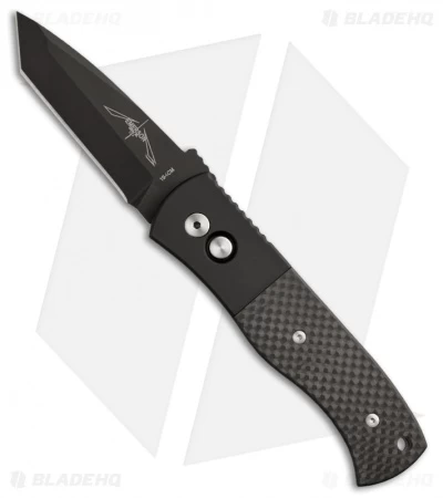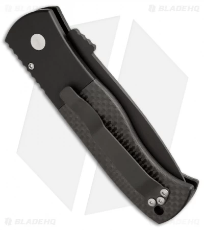 This CQC-7 knife features carbon fiber inlays and a black anodized aluminum frame. Includes a pocket clip for tip-up carry. The chisel ground tanto blade is black finished 154-CM stainless steel.