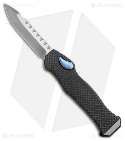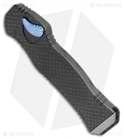 This Hydra by Heretic Knives is a powerful single-action OTF automatic knife built with a unique, blue anodized titanium swiveling button safety. It features a two-tone bead blast/stonewashed blade with grooved jimping along the spine. Its carbon fiber handle is comfortably contoured and textured for secure use. The knife comes complete with a double-pronged pocket clip and a carbon fiber charging handle grip insert.