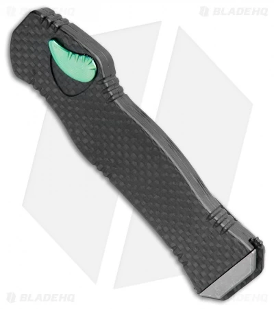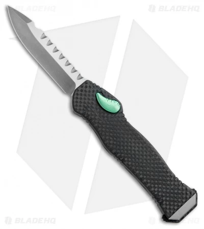 This Hydra by Heretic Knives is a powerful single-action OTF automatic knife built with a unique, green anodized titanium swiveling button safety. It features a two-tone bead blast/stonewashed blade with grooved jimping along the spine. Its carbon fiber handle is comfortably contoured and textured for secure use. The knife comes complete with a double-pronged pocket clip and a carbon fiber charging handle grip insert.