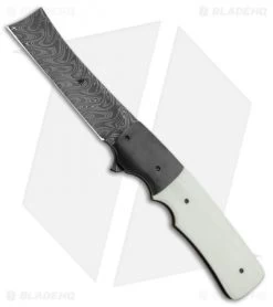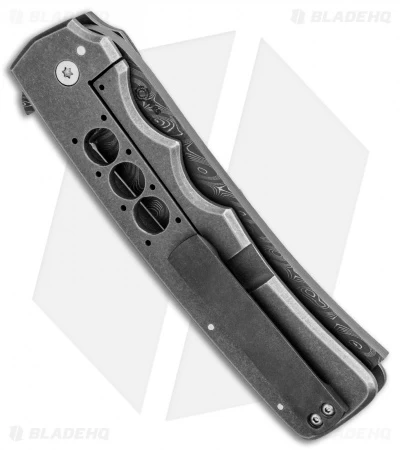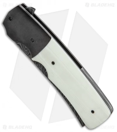 This custom Razor design from Jason Clark has a hollow ground, flat tip Boomerang Damascus steel blade. The handle is outfitted with a Zirconium bolster, White G-10 front scale, and a tumbled titanium frame lock. An IKBS ball-bearing pivot ensures smooth action with the flipper opener. Comes fitted with a milled Zirconium pocket clip.