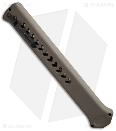 This edition of the Estiletto features arrow cutouts on the front and back of the dark earth brown finished aluminum handle. It is matched up with a black coated clip point blade with plain and partially serrated edges.