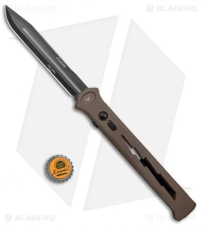 This edition of the Estiletto features lightning bolt cutouts on the front and back of the dark earth brown finished aluminum handle. It is matched up with a black coated clip point blade with a double edge.