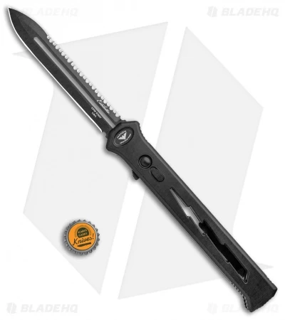 This edition of the Estiletto features lightning bolt cutouts on the front and back of the black finished aluminum handle. It is matched up with a black coated dagger blade with one plain edge and one serrated.