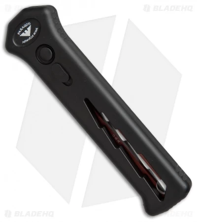 The Paragon PARA-X OTF knife is the next generation of the ATKO-10. This Asheville Steel automatic is a single action out-the-front knife, just push the button and the blade fires out the front of the handle. To close the blade just press the button and use the retracing lever to pull the blade back in. The PARA-X has a sliding safety under the firing button and a pocket clip for easy tip-down carry. Made in the USA and new in box.