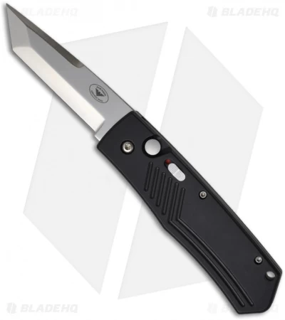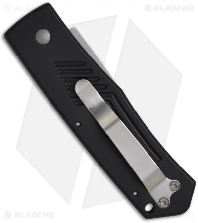 The White Shadow Tanto automatic knife from Paragon. This great knife has a 154CM stainless steel blade that has been hand ground by Eddie White of ShadowKnives.com. The handle is black anodized aluminum with a steel backspacer and satin pocket clip (tip-up) for easy carry. The action on the White Shadow is great and the lock-up is solid! These are made in the USA.