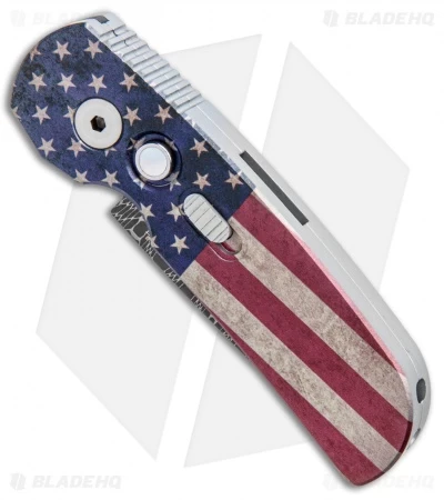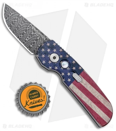 The Pro-Tech Calmigo is a compact automatic knife geared toward everyday carry and general utility. This PK Custom anodized Calmigo model sports a stout CA legal drop point blade made from Vegas Forge damascus steel. Its handle features a custom anodized Vintage Flag pattern by Peter Kellett and a mother of pearl push button. The Calmigo is fitted with a sliding safety lock and a deep carry pocket clip, making it a comfortable and secure EDC option.